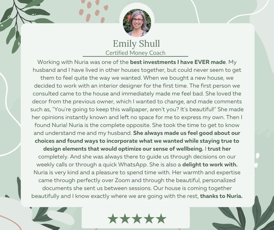 GET THE EBOOKThank you for downloading the Ultimate Checklist to Create a Wellbeing Interior Design. You will receive an email with instructions for the download in a couple of minutes. By going through the checklist, you will get a clear view of what is missing in your design to make your environment become a healthier and happier place for you! To apply these elements to your environment, you´ll need a guide. It can be an interior designer like me or a GUIDE I have written for you, in case you want to do it yourself.